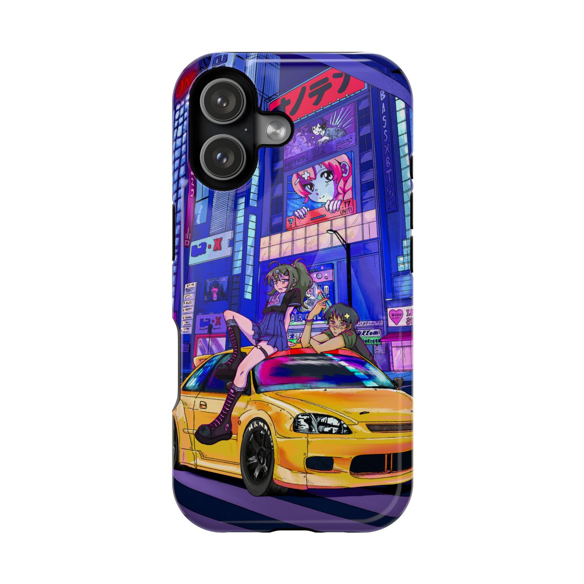 Night drives through neon-lit cityscapes — this slim, impact-resistant phone case brings that rush to your pocket. The full-wrap, high-resolution artwork features anime-inspired characters lounging on a sleek yellow sports car beneath towering billboards and pulsing lights. Choose glossy for a vivid, reflective finish that amplifies the neon palette, or matte for a smoother, toned-down sheen. Built with a removable black TPU inner layer and a rigid polycarbonate outer shell, it absorbs daily bumps while keeping wireless charging fully functional. It feels light in hand but tough when you need it, merging street-style attitude with everyday protection.