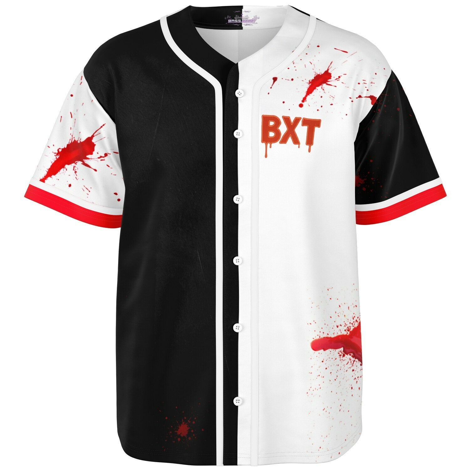 The design splits cleanly between black and white panels, drenched in vivid red splatter for that cinematic slasher edge. The front showcases the bold BXT insignia, while the back features Brittney’s hand-illustrated masked siren a haunting mix of beauty and menace, framed by the dripping Fright Night title.