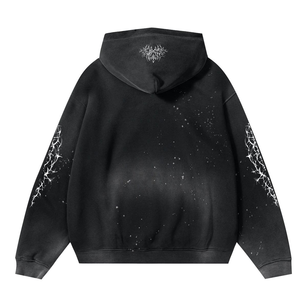 A trendy street-style hoodie featuring a unique design with splatter ink effects and irregular fading for a distressed, edgy look. The hoodie showcases artistic details such as frayed edges, shredded holes, and a worn-out aesthetic, giving it a bold and rebellious vibe. Made with 52% cotton and 48% polyester, it offers both comfort and durability. Plus, it comes with a fleece lining to keep you warm and stylish during colder days. A perfect blend of fashion and attitude!